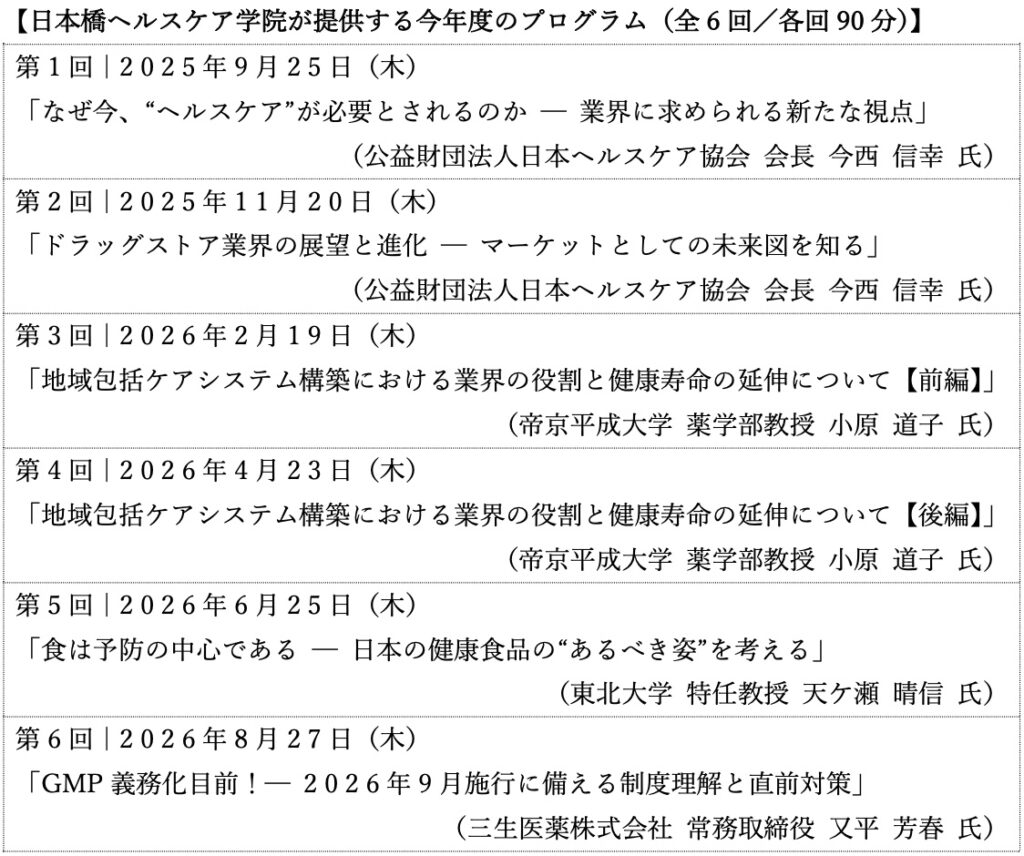 90分に渡る講演の中で今西氏は、ヘルスケアすなわち予防は医療と皆保険制度を守るために必須であること、また治療が医を頂点としたヒエラルキーであるのに対し、予防の中心は食であることも強調。政策内容で分かれる関係省庁の連携を促しヘルスケア産業の発展に寄与することがJAHIの役割であると述べている。 なお全6回の講義は、日本橋ヘルスケア学院の参画企業(日健工会員ら)にアーカイブ配信する。第1回配信は10月初旬を予定している。全6回の講義内容は以下の通り。