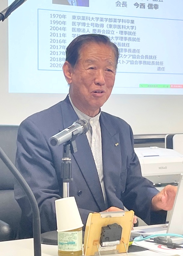 第1回講義に登壇した今西学院長は、JAHIの会長であると同時に現職の医師である。また薬科大学理事長ならびに日本チェーンドラッグストア協会事務総長を歴任するなど、医・薬・食(の流通)に精通している。その独自の立場から、「なぜ今、“ヘルスケア”が必要とされるのか」というテーマで講演した。